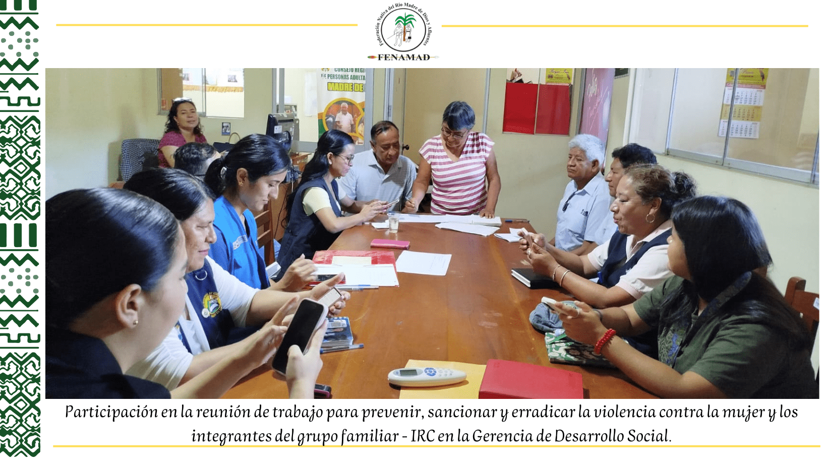 En el ámbito social, FENAMAD participó activamente en la reunión de la Instancia Regional de Concertación (IRC) para la prevención y erradicación de la violencia contra la mujer y el grupo familiar, reafirmando su compromiso con la defensa de los derechos humanos y la articulación interinstitucional frente a esta problemática.