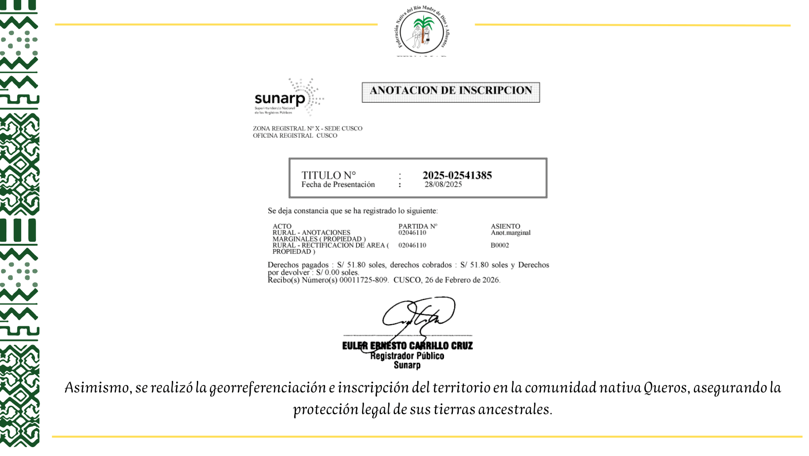 Asimismo, se realizó la georreferenciación e inscripción del territorio en la comunidad nativa Queros, asegurando la protección legal de sus tierras ancestrales.