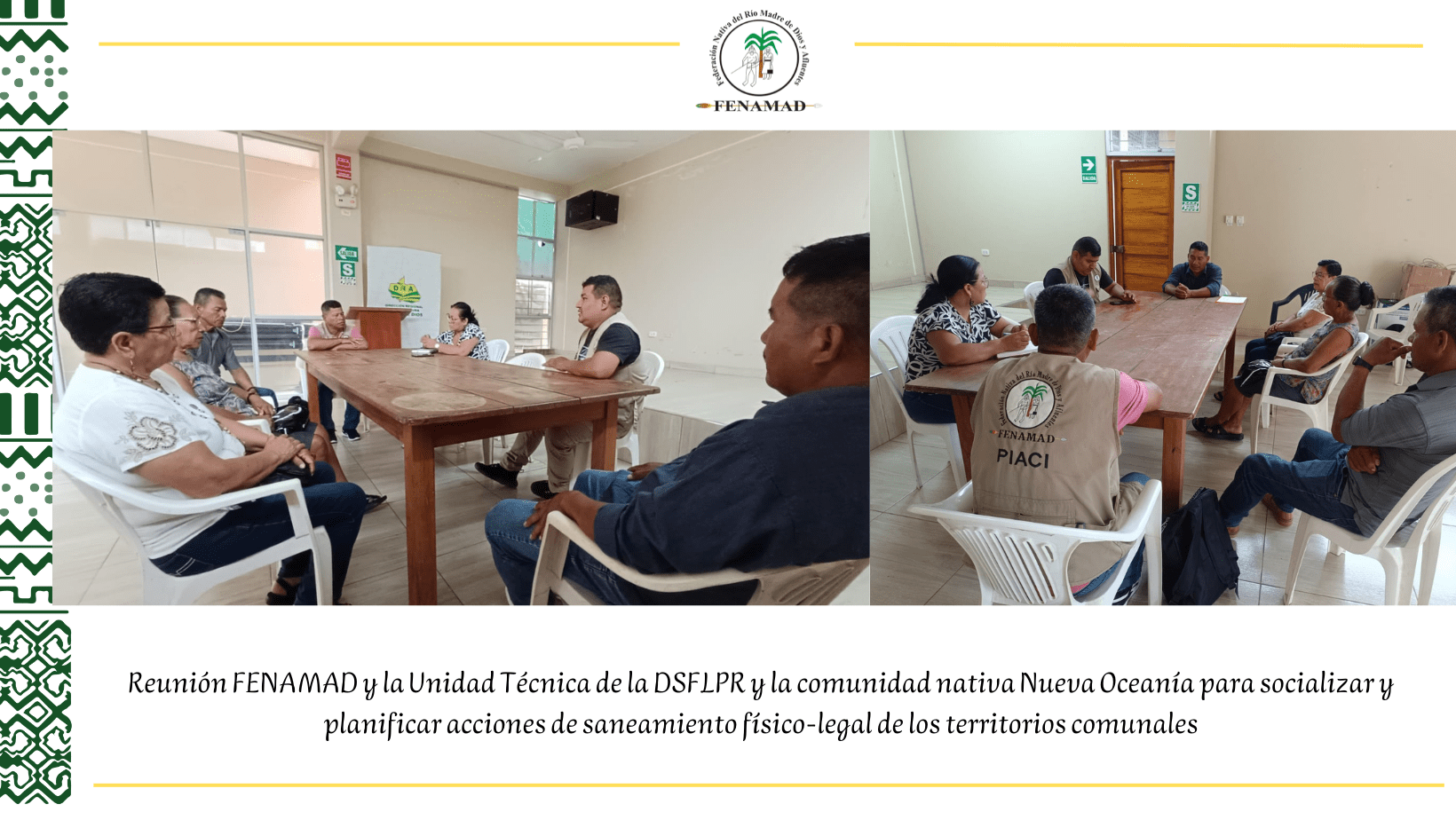 Con el fin de planificar acciones concretas, hubo una reunión de coordinación entre FENAMAD, la Unidad Técnica de la Dirección de Saneamiento Físico Legal de la Propiedad Rural (DSFLPR) y la comunidad nativa Nueva Oceanía para socializar y planificar el saneamiento físico-legal de los territorios comunales, garantizando un proceso participativo y efectivo.