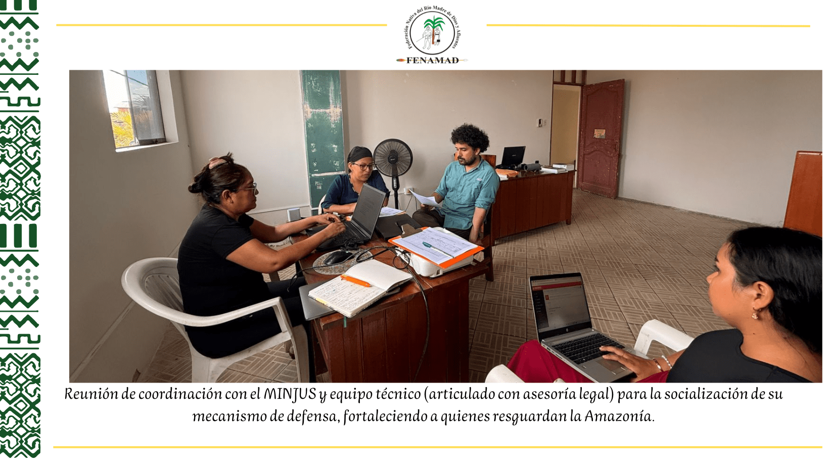 Para fortalecer la protección de defensores ambientales, se coordinó una reunión con el MINJUS y equipo técnico (articulado con asesoría legal) para la socialización de su mecanismo de defensa, fortaleciendo a quienes resguardan la Amazonía.